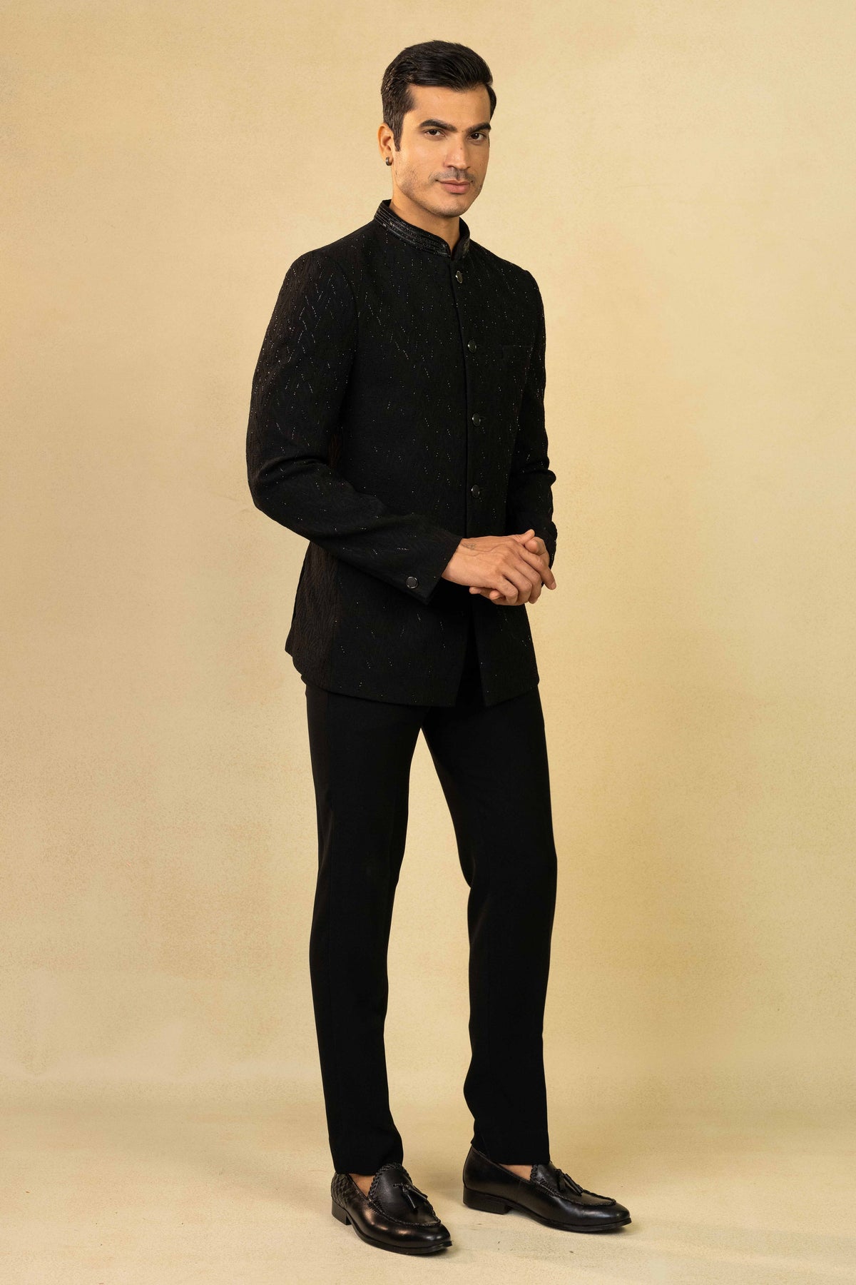 Classic black jacquard jodhpuri suit featuring elegantly scattered cut dana embroidery, carefully aligned with the intricate jacquard pattern to create a subtle, refined, and sophisticated finish, perfectly blending traditional craftsmanship with modern design, ideal for formal occasions, weddings, cultural events, and statement-making social gatherings.