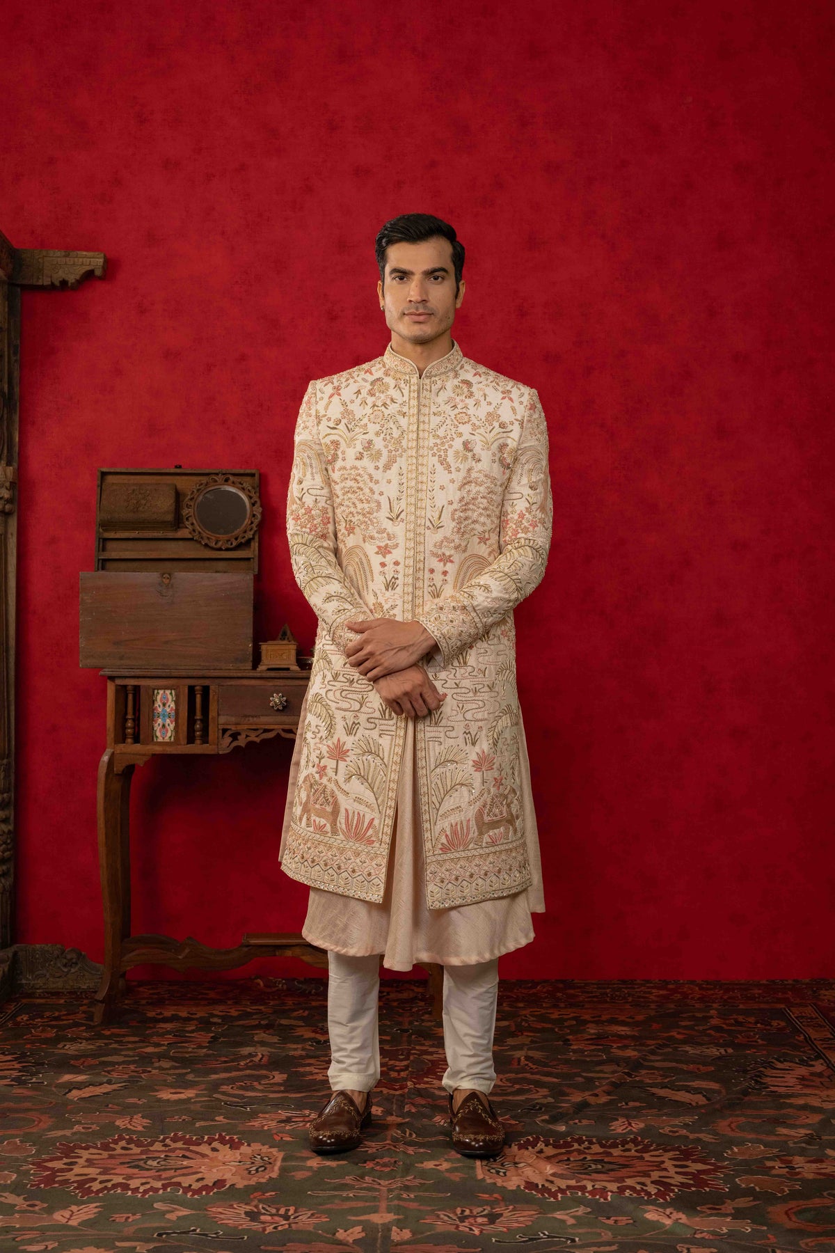 Distinguished sherwani inspired by the natural world, featuring intricate floral and foliage motifs that reflect the elegance of botanical artistry, crafted in a serene peach dust hue, and lavishly embellished with luxurious zardosi embroidery and delicate moti (pearl) detailing, perfectly designed to create a sophisticated, statement-making outfit ideal for weddings, festive celebrations, and prestigious cultural events.