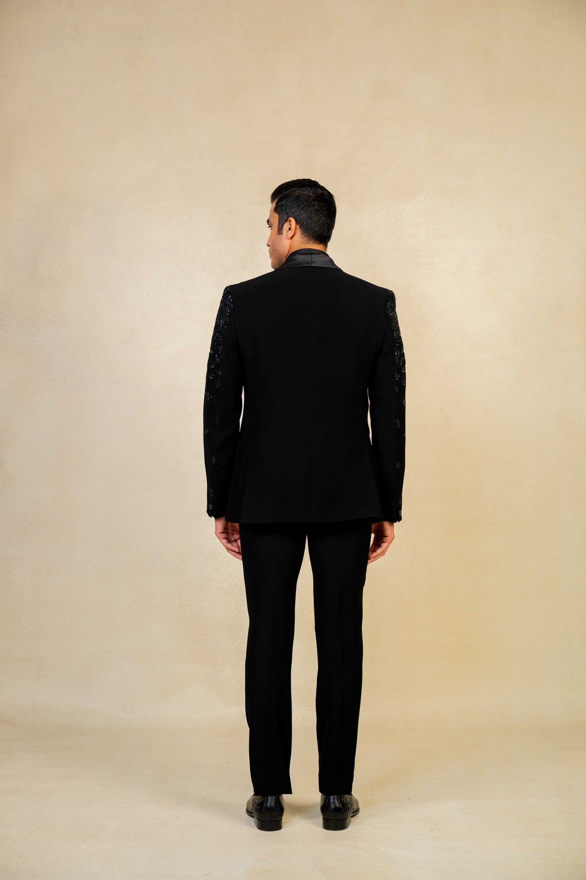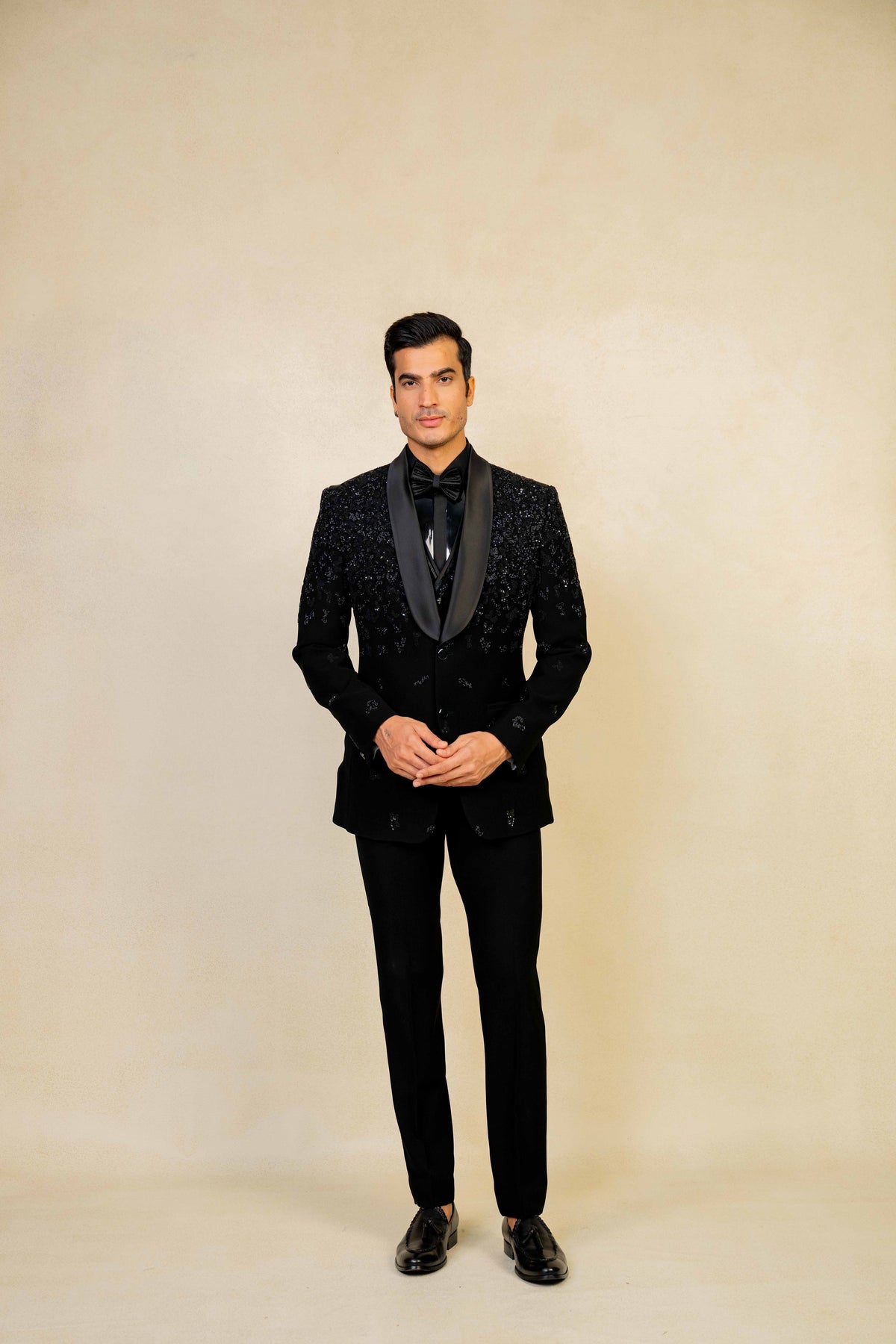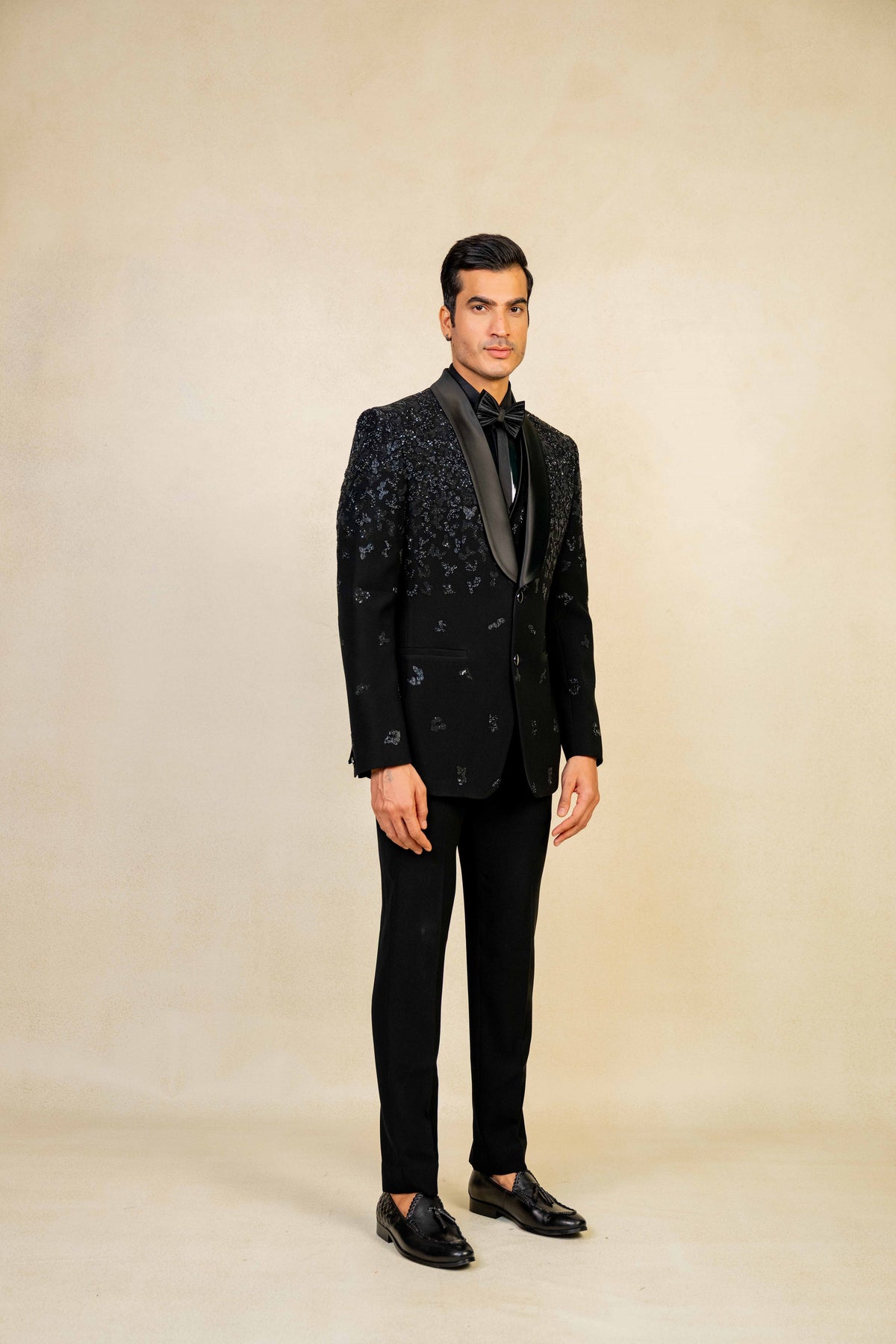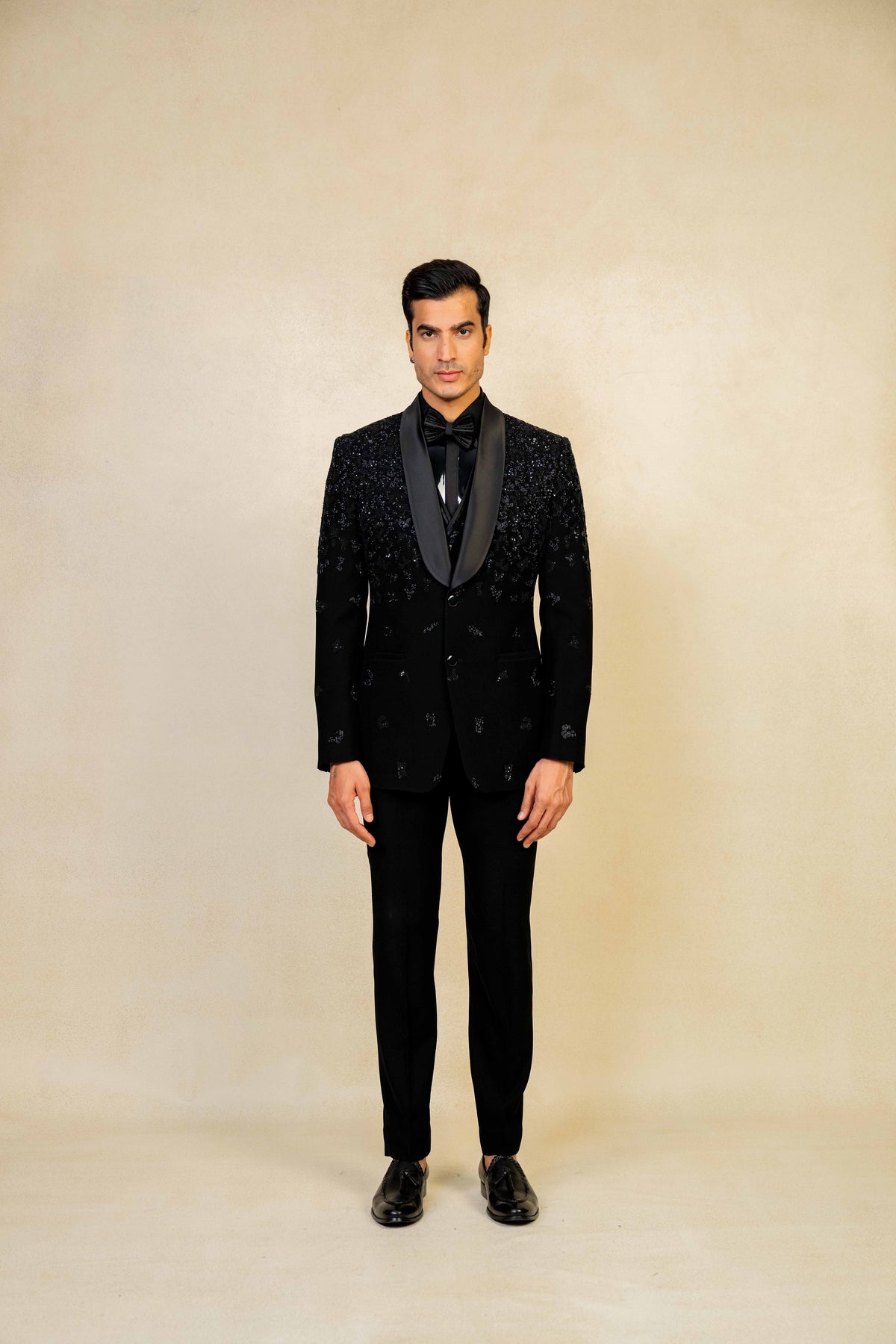 Elegant tuxedo featuring an abstract geometric motif, meticulously crafted with cut dana, salli, and sequin embroidery arranged in a sophisticated scattered pattern, showcasing exceptional artisanal skill and attention to detail, perfectly designed to create a statement-making, refined outfit ideal for weddings, formal gatherings, cultural events, and prestigious occasions.