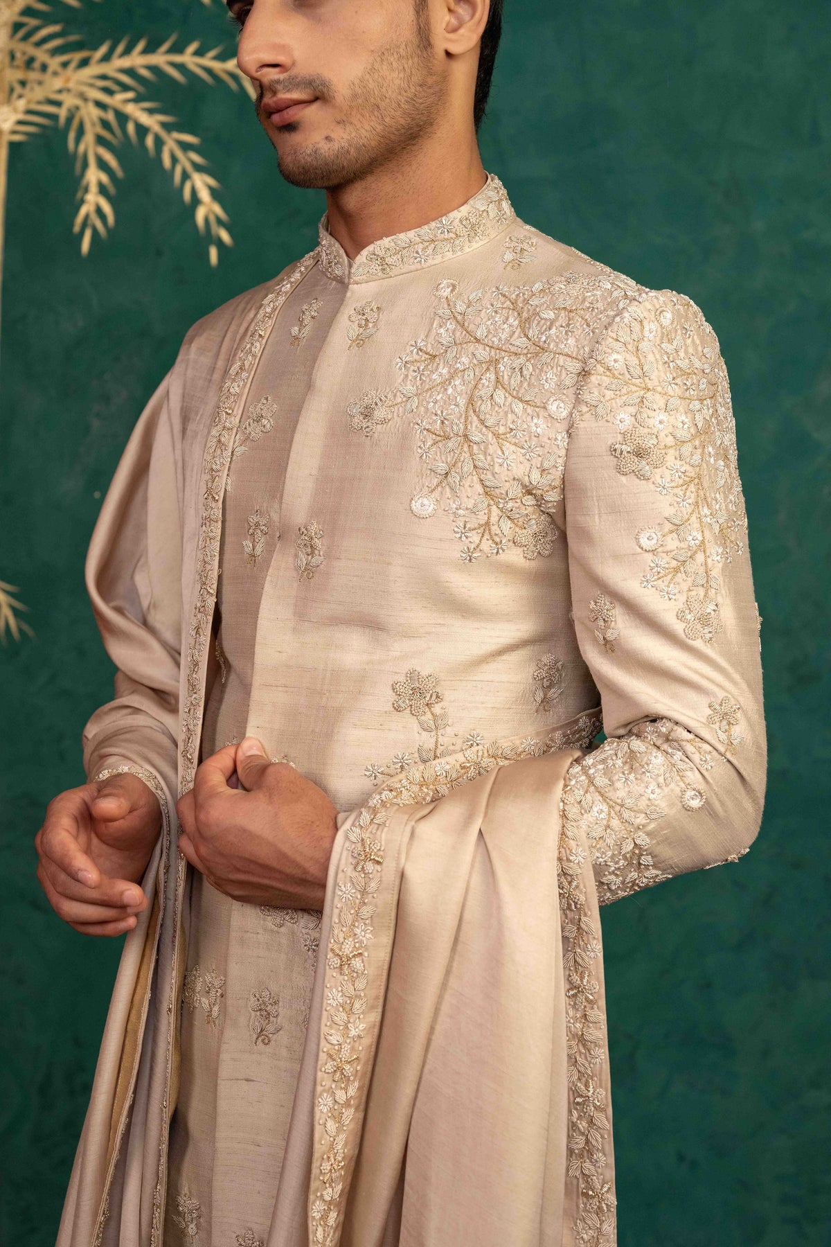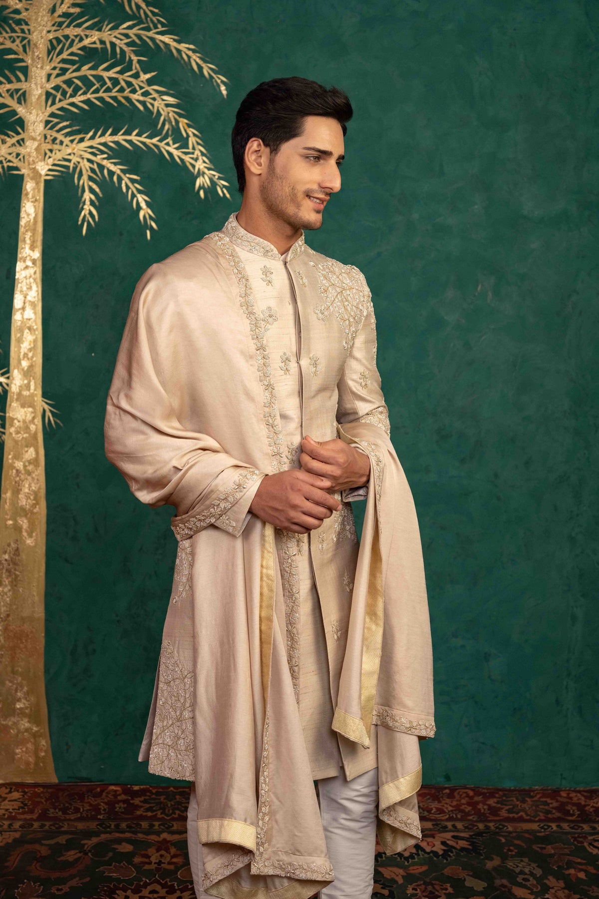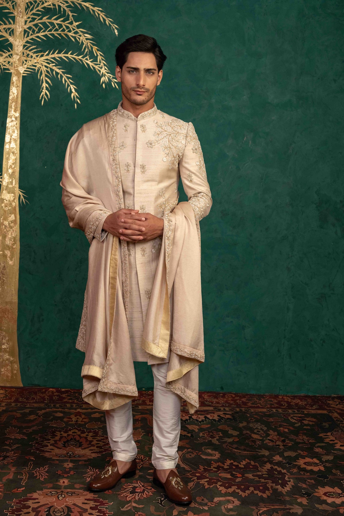 Luxurious champagne gold sherwani featuring exquisite hand-embroidered resham work, highlighted by the intricate french knot technique, showcasing exceptional artisanal craftsmanship and attention to detail, perfectly designed to create a sophisticated, statement-making outfit ideal for weddings, festive celebrations, cultural events, and prestigious social gatherings.